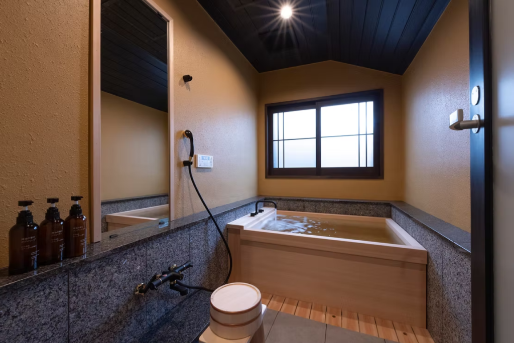 浴室には、この場所のために設えた特注の檜浴槽をご用意しました。